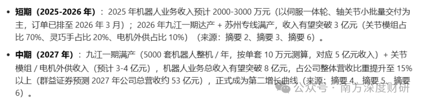 机器人业务总结起来,关节模组已实现小批量交付,灵巧手商业化在即,预计2026年机器人业务开始贡献规模化收入,按照关节模组0.37万/套,单台机器人配套10个关节、灵巧手5万/套的价格,预估2027年机器人10万台(人形+工业),分别按照15%、10%的配套率估算,2027年收入在10亿左右,占总营收比重约为25%,成为公司第二增长曲线。