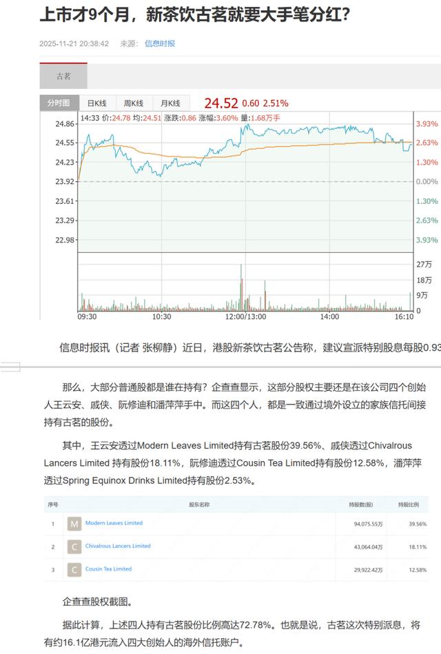 据此计算,上述四人持有古茗股份比例高达72.78%。也就是说,古茗这次特别派息,将有约16.1亿港元流入四大创始人的海外信托账户。