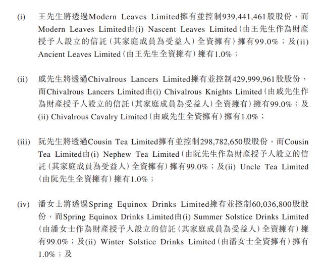 其中,王云安透过Modern Leaves Limited持有古茗股份39.56%,戚侠透过Chivalrous Lancers Limited 持有股份18.11%,阮修迪透过 Cousin Tea Limited持有股份12.58%,潘萍萍透过Spring Equinox Drinks Limited持有股份2.53%。