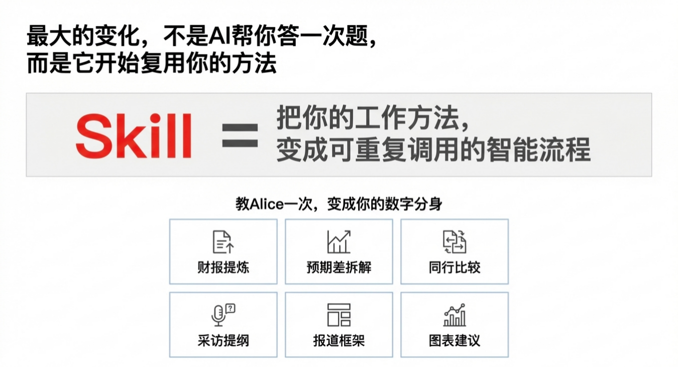 除了上述五大场景,AI Agent更重要的一个变革是把自己最擅长的工作方法变成可复用的Skill。这意味着我们不仅可以借助AI迅速完成任务,还可以培养和拥有无数个越来越像自己的数字分身。