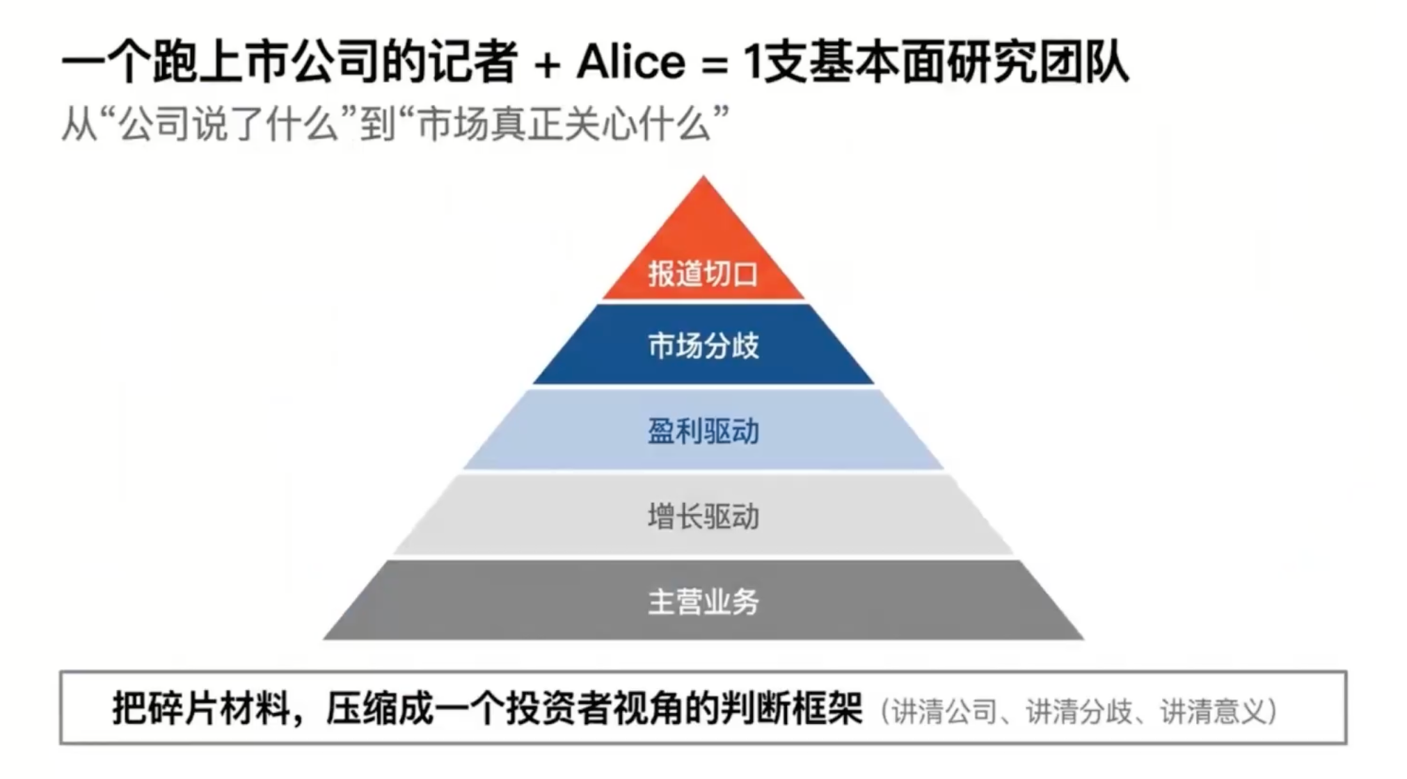 Alice还可以进一步拆解上市公司的核心逻辑、市场分歧点、报道切入口,它会变得越来越像一支基本面的研究团队,而不只是去解释市场,它能够穿透公司。