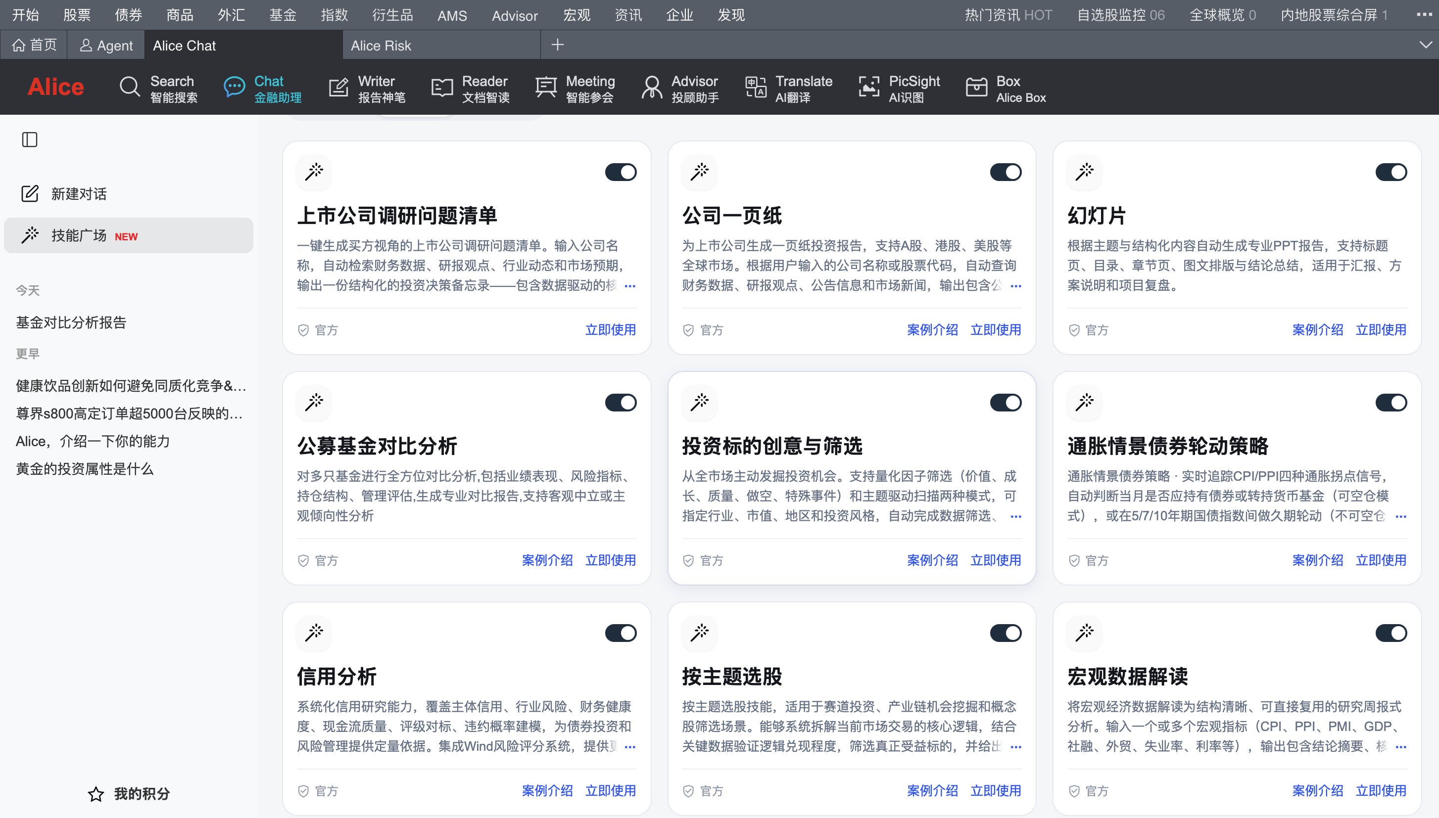 在Alice 的技能广场,提供上百种Wind官方技能去适配实际需求,提问越多它解锁的技能就越多。每个人做事情都会有自己的方法论,越是优秀的记者,越带有自己独特的研究视角或分析视角。通过点击创建技能,可以把自己的做事方式以自然语言告诉Alice,它就能够帮助记者刨根问底,调用上千万个智能体工具和MCP工具完成工作。完成技能创建后,Alice就可以将之变成稳定的、可反复调用的工作流。