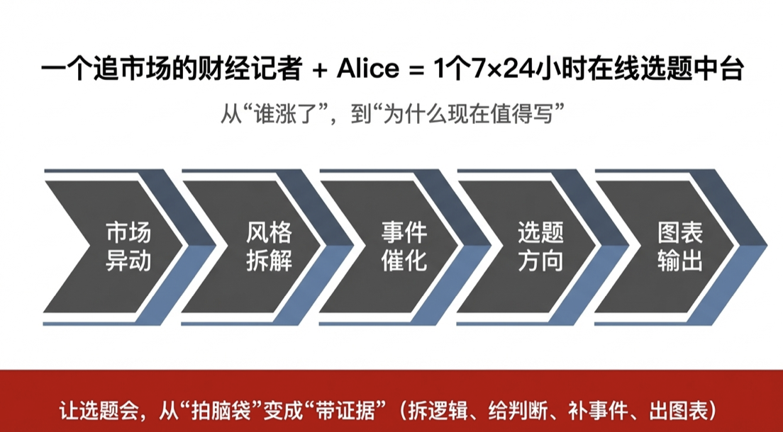 过去,财经报道需要紧盯信息流,AI Agent的出现宛如为记者提供了一支随时可调度的“智能团队”。我们打造的Alice就是一个7×24小时随时在线的选题中台。