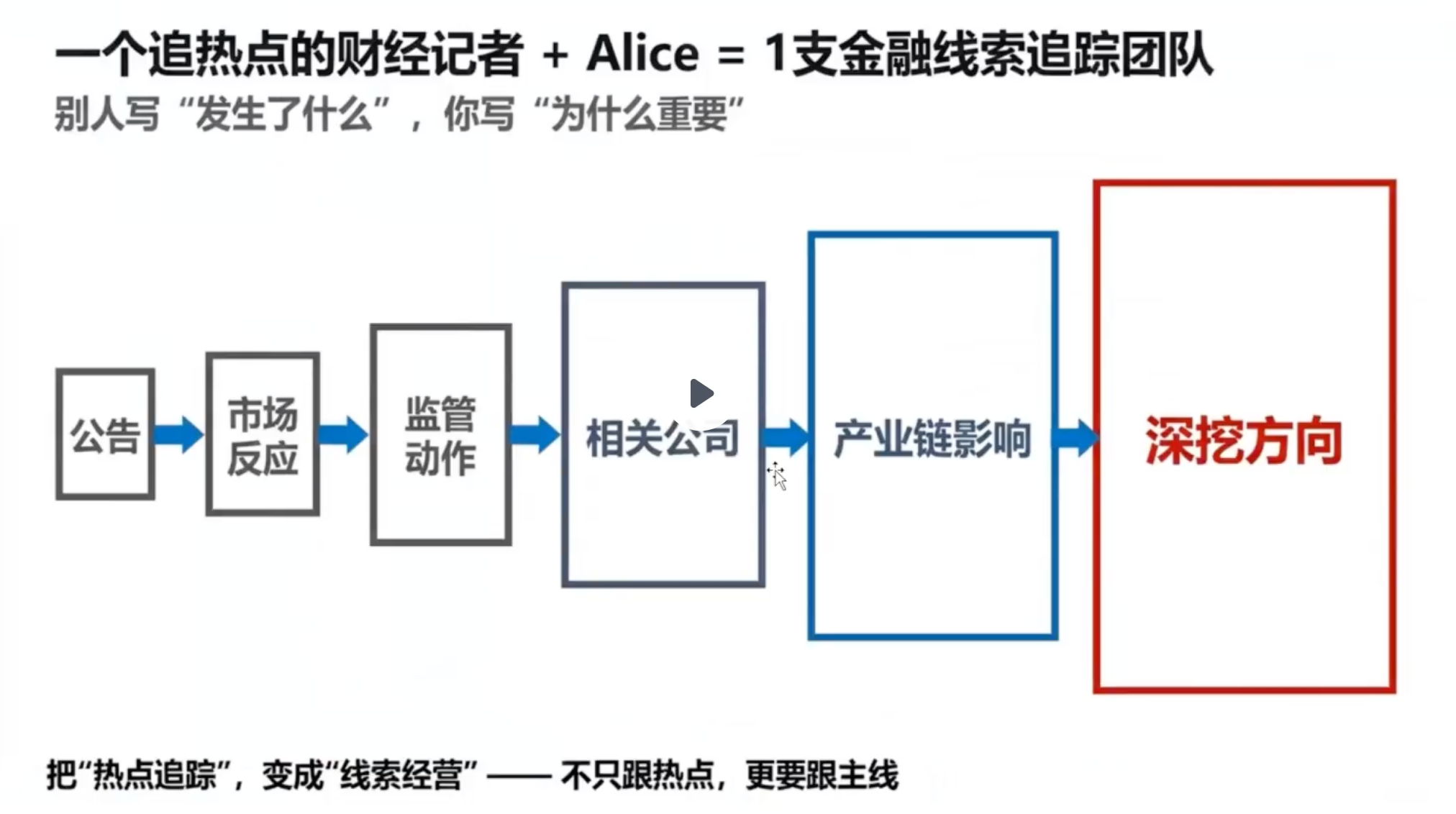 Alice生成的内容并不是完整的成熟稿件,核心是赋予记者三层能力:第一层能力是如何讲清楚一个公司的核心业务逻辑;第二层能力是怎么把市场真正关心的视角说明白;第三层能力是如何找出报道的切口和主题。这是一个从公司发布内容到市场观点的升级过程。