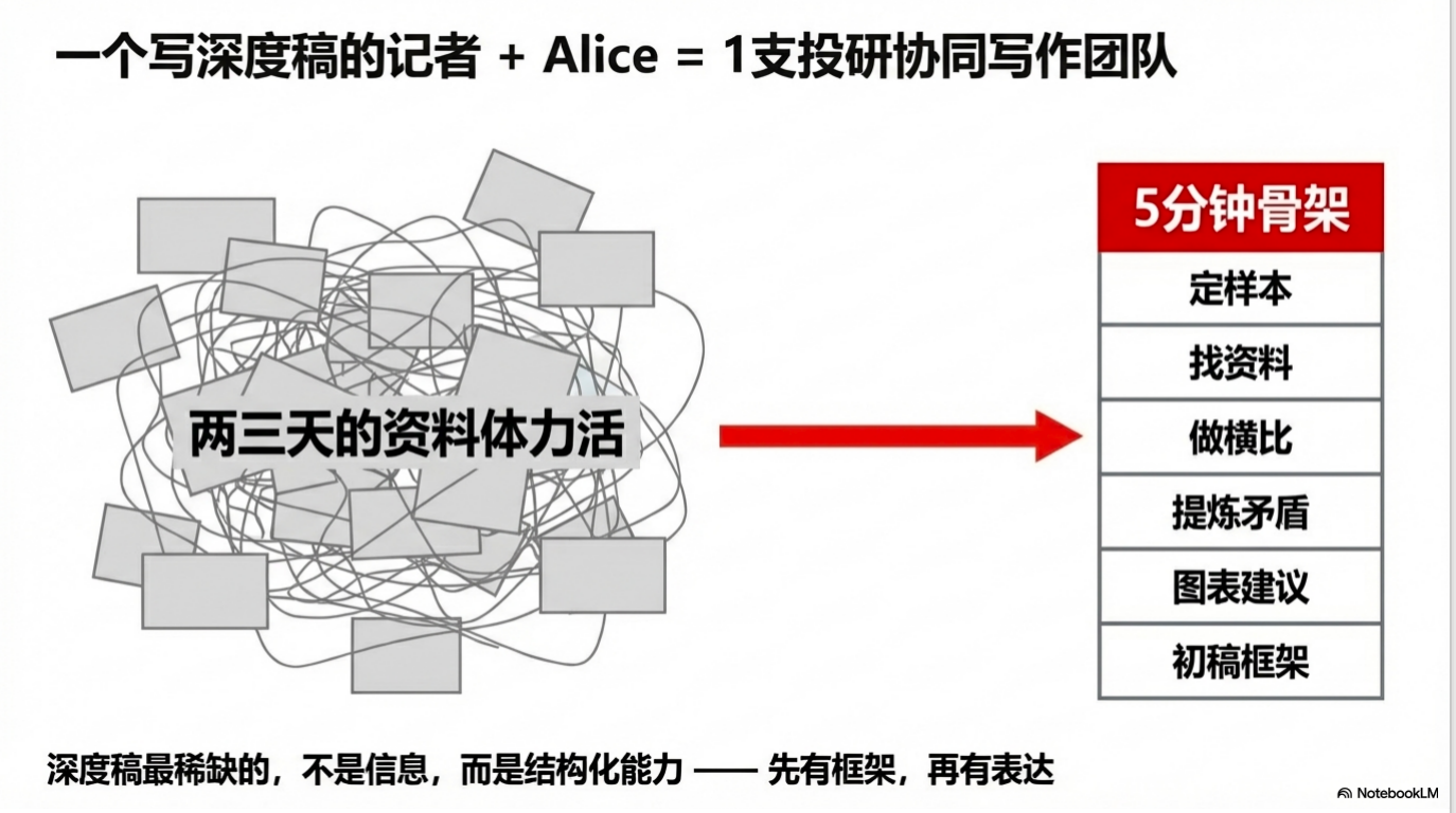 这类资料收集工作过去需要两三天的体力投入,现在Alice帮你把它缩成了五分钟之内能出的骨架和框架,配上后续补访,大概也就一小时的工作量,这至少是上百倍的效率突破。