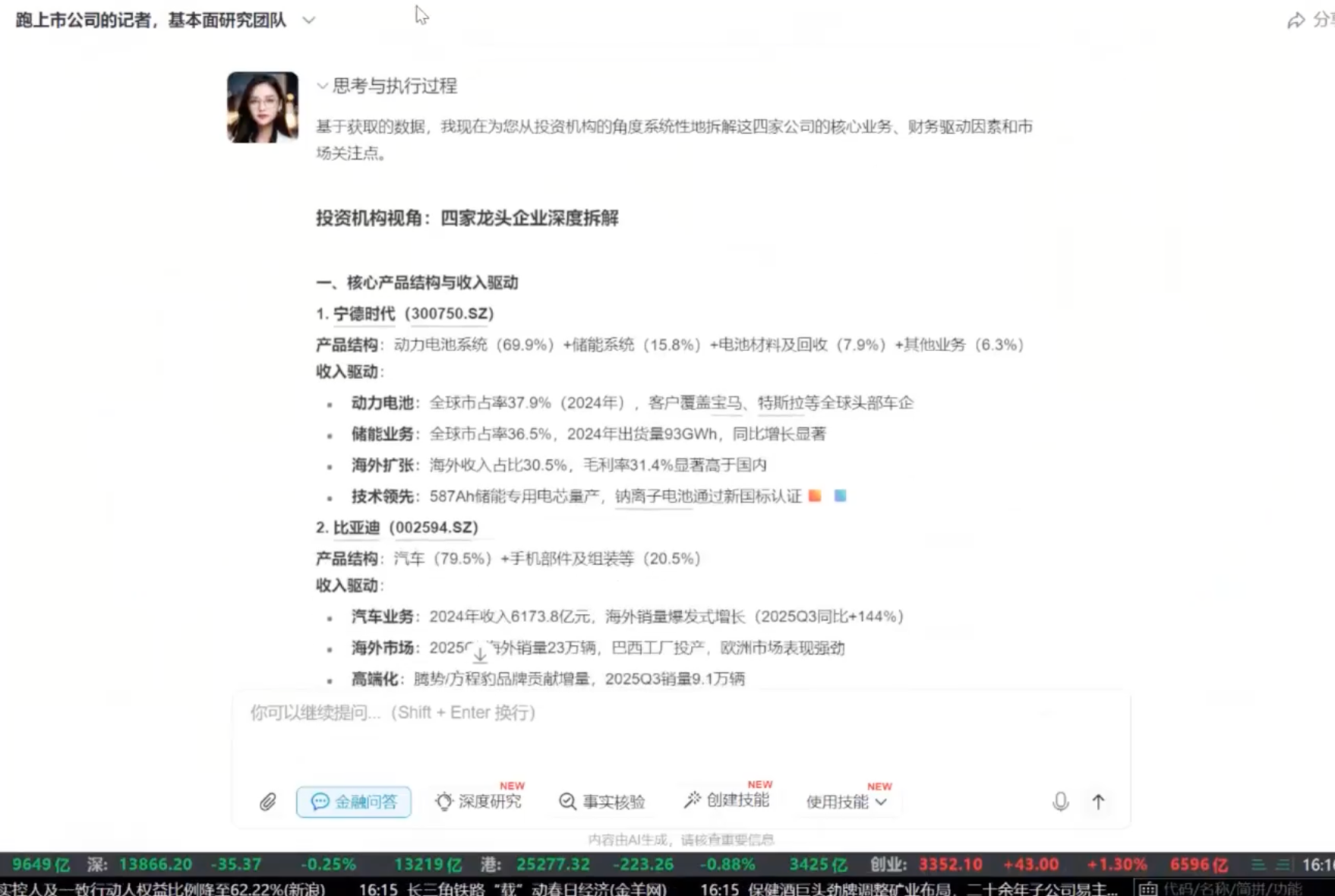 比如在系统内进行提问:请你用投资机构看公司的方式,快速地拆解宁德时代、比亚迪、寒武纪、中芯国际的核心产品结构、收入驱动、利润驱动、关键经营指标以及近两年市场最关心的核心分歧,并且站在财经记者的角度给出三个切入点。Alice就会快速从Wind底层数据库中收集各种各样的定量、定性信息,快速进行公司基本面分析和比较。