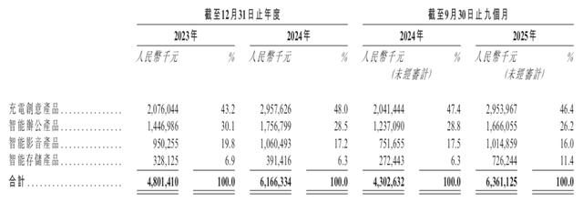 2023年、2024年度和2025年前三季度(即“报告期”),绿联科技来自充电创意产品的收入分别为20.76亿元、29.58亿元和29.54亿元,在总收入中的占比分别达到43.2%、48.0%和46.4%,占据近半江山。