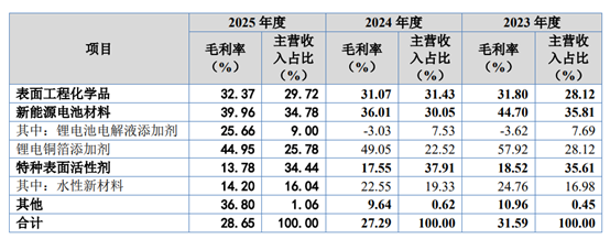 新能源电池材料板块作为公司第一大业务,其核心电解液添加剂在2023年、2024年毛利率分别为- 3.62%、- 3.03%,连续两年亏本销售;2025年虽回正至25.66%,但仍低于2022年26.22%的水平。锂电铜箔添加剂毛利率亦由2023年的57.92%降至2025年的44.95%,降幅超10个百分点。整个新能源电池材料板块毛利率从44.7%下跌至39.96%。而公司只能靠低毛利传统业务撑住整体利润,核心高成长赛道逻辑彻底崩塌。