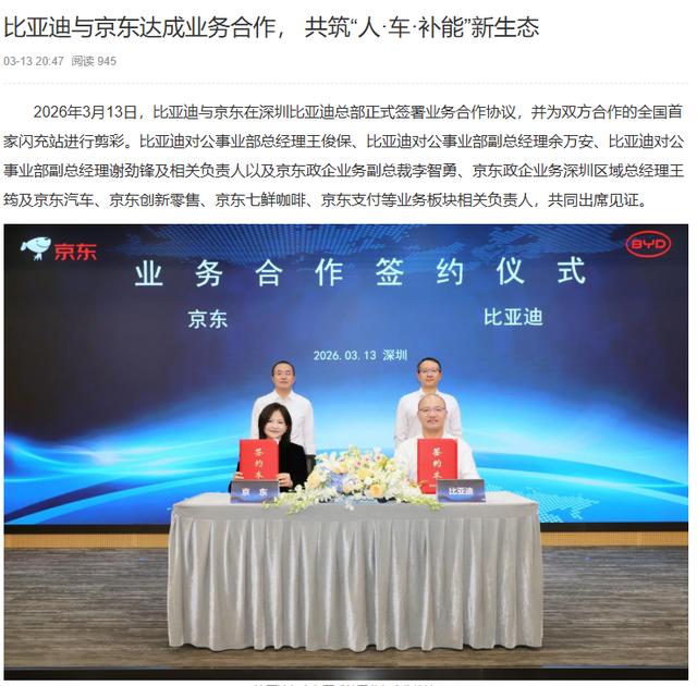 另一张在深圳。3月13日,京东与比亚迪在深圳正式签署业务合作协议,并为双方合作的全国首家闪充站剪彩,七鲜咖啡作为核心服务入驻。