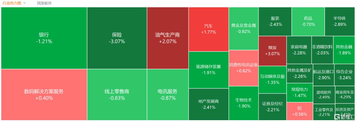 盘面上,作为市场风向标的大型科技股部分回暖转涨,美团涨2.4%,小米涨近1%;机构指地缘冲突有望推高国际能源价格与煤炭替代需求,石油股、煤炭股全天逆势走强,汽车股午后拉升明显,新消费概念股、互联网医疗股部分上涨。另一方面,多国减产推动原油价格暴涨,或显著侵蚀航空公司利润,航空股持续跌势,存储概念股、重型机械股、濠赌股纷纷下跌。