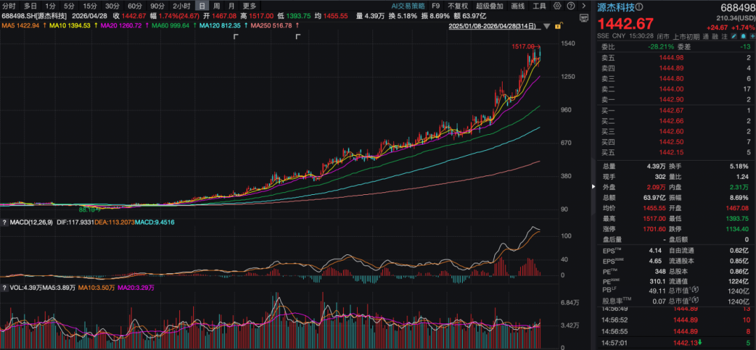 截至4月28日收盘,源杰科技报收于1442.67元/股,当日上涨1.74%,超越贵州茅台(1405元/股),成为A股“新股王”,近一年股价涨幅超13倍,动态PE为348倍,市值为1240亿元。