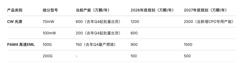 这两个扩产公告并未披露具体的产能目标,但预计2026年底,会有相应部分产能落地。之前,源杰科技公告的美国产能也有望在2026年下半年陆续释放。