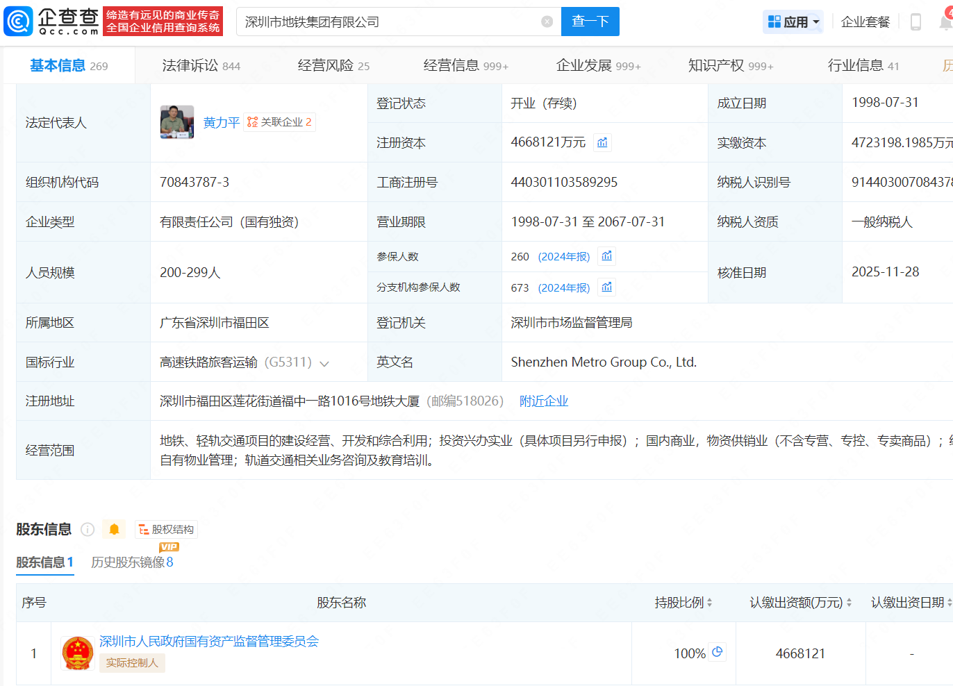 企查查APP显示,近日,深圳市地铁集团有限公司发生工商变更,辛杰卸任法定代表人,由黄力平接任,同时,黄力平由总经理改任经理。企查查信息显示,该公司成立于1998年7月,注册资本约466.8亿元,经营范围包括地铁、轻轨交通项目的建设经营、开发和综合利用等,由深圳市人民政府国有资产监督管理委员会全资持股。