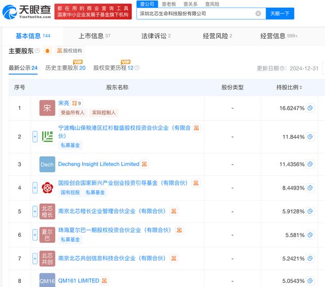 天眼查App信息显示,北芯生命成立于2015年12月,位于深圳市龙华区。目前,该公司的注册资本为3.6亿元,法定代表人为宋亮,主要股东包括宋亮、红杉中国、德诚资本、启明创投等。