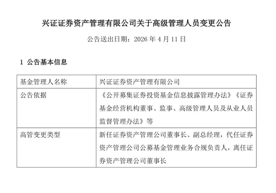 蓝鲸新闻4月13日讯(记者 王婉莹)日前,兴业证券(601377.SH)全资子公司兴证证券资产管理有限公司(下称“兴证资管”)发布高管变更公告,正式任命王焕舟为公司董事长,原董事长刘宇因工作调动原因不再担任该职。此外,王焕舟还代任公募基金管理业务合规负责人。
