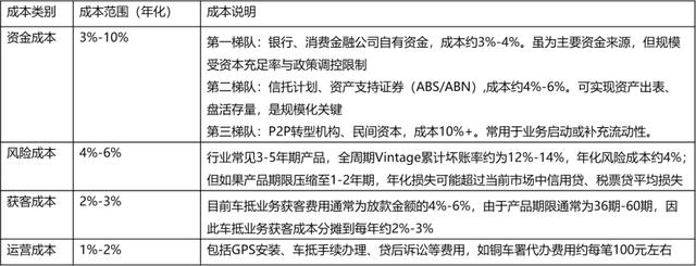 在成本方面,车抵贷业务主要成本通常由资金成本、风险成本、获客成本、运营成本构成。根据车抵贷业务展业机构的成本控制情况: