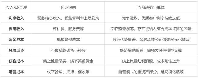 不过,车抵贷业务没有消金那样想象中“暴利”。目前一笔车抵贷业务的净利润,可以简化为一个简单的公式:净利润 ≈ (利息收入 + 费用收入)-(资金成本 + 风险成本 + 获客成本 + 运营成本)。