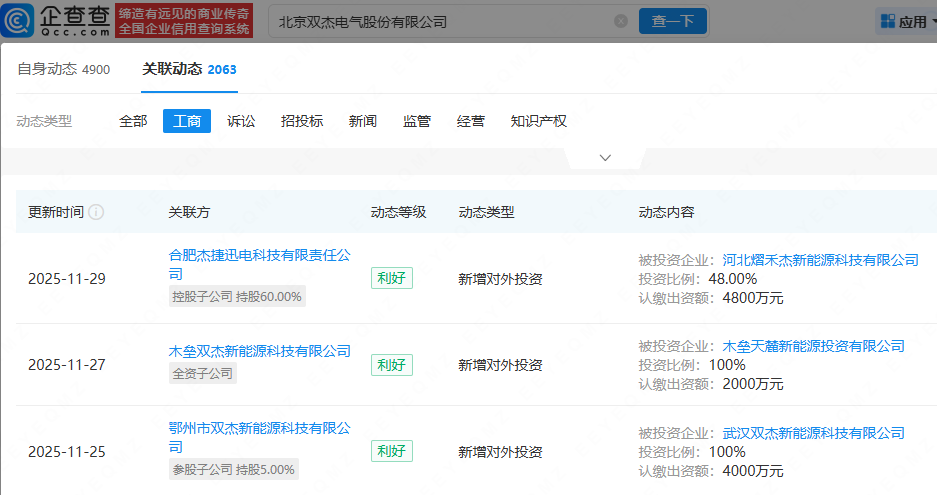 企查查APP显示,近日,河北熠禾杰新能源科技有限公司成立,法定代表人为杨梓垚,注册资本为1亿元,经营范围包含:电池销售;光伏设备及元器件销售;风力发电技术服务;节能管理服务;储能技术服务等,由禾泓产业发展有限公司、双杰电气(300444)旗下合肥杰捷迅电科技有限责任公司共同持股。企查查显示,双杰电气还对外投资成立了木垒天麓新能源投资有限公司、武汉双杰新能源科技有限公司。
