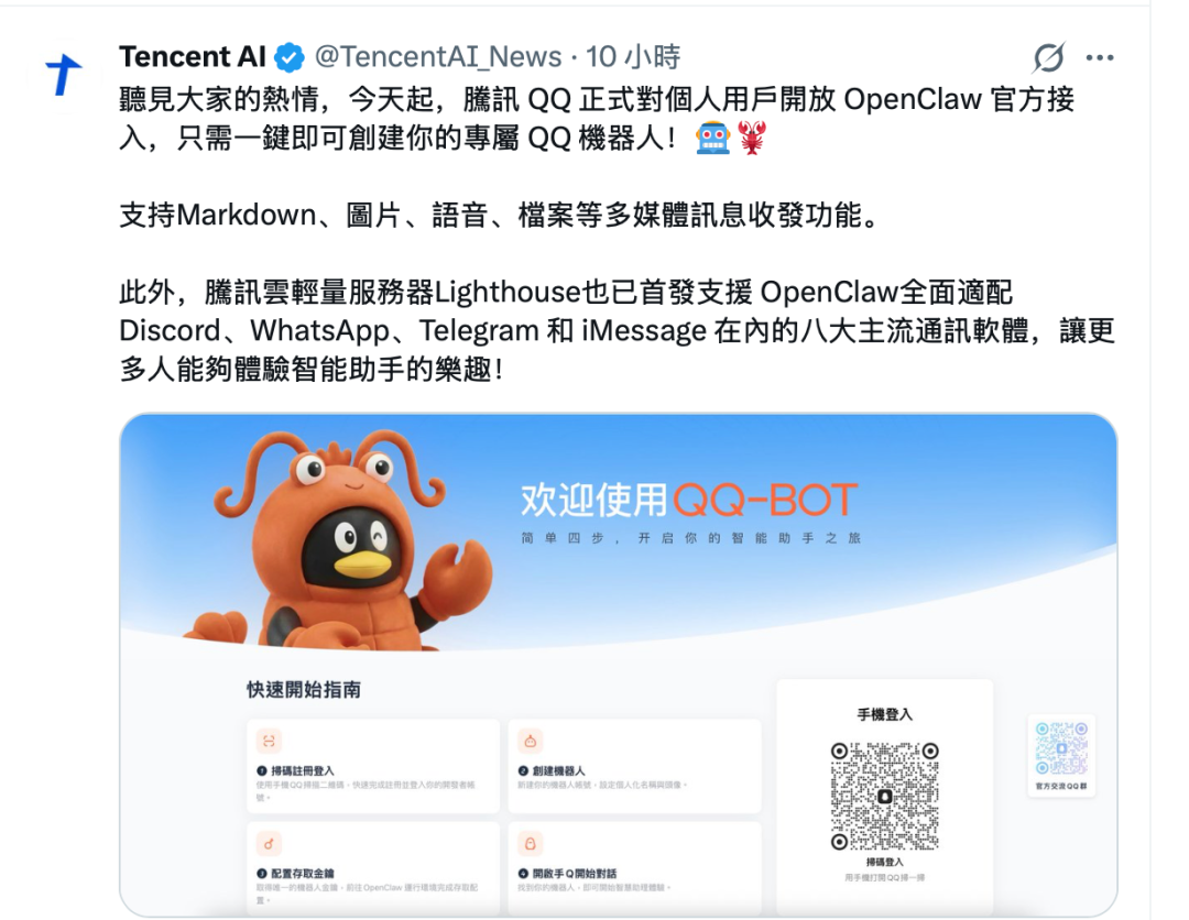 此外,大厂们也在防备开源工具脱离自己的掌控。最新的动作是,腾讯QQ已正式对个人用户开放了OpenClaw的官方接入,用户可以一键创建专属的QQ机器人。不仅如此,腾讯云轻量服务器Lighthouse也首发支持了适配Discord、WhatsApp等八大主流通讯软件。