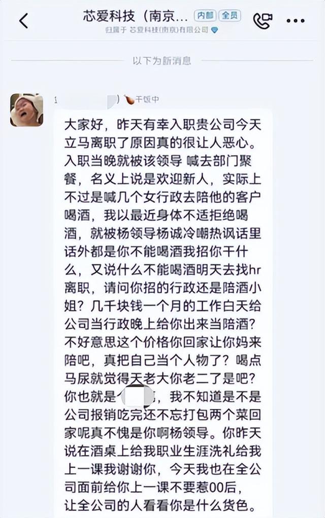 1月17日消息,今天网上流传出一张截图,显示在芯爱科技(南京)有限公司的一个社群内,一位刚入职的员工表示自己“入职当晚就被领导喊去部门聚餐,名义上说是欢迎新人,实际上不过是喊几个女行政区陪他的客户喝酒”,该员工表示自己婉拒之后,遭到了其领导的冷嘲热讽,因此她选择第二天就离职,并在群内喊话表示“几千块钱一个月的工作,白天给公司当行政,晚上给你出来当陪酒?”最后她还告诫那位职场领导“不要惹00后”。