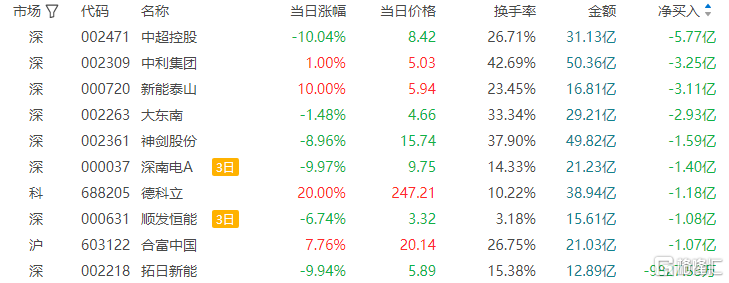 龙虎榜单日净卖出额前三为中超控股、中利集团、新能泰山,分别为5.77亿元、3.25亿元、3.11亿元。