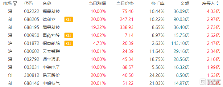 龙虎榜单日净买入额前三为福晶科技腾景科技、云赛智联,分别为4.03亿元、2.73亿元、2.34亿元。