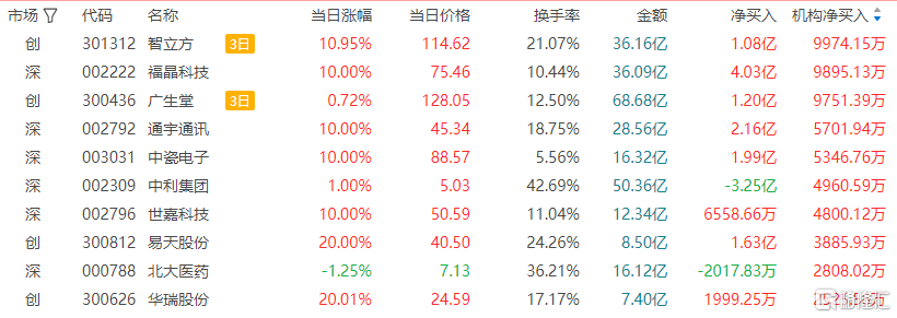 龙虎榜中涉及机构专用席位的个股中,当日净买入额前三为福晶科技、通宇通讯中瓷电子,分别为9895.13万元、5701.94万元、5346.76万元。