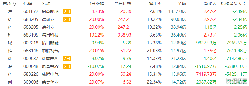 龙虎榜中涉及机构专用席位的个股中,当日净卖出额前三为德科立、腾景科技、拓日新能,分别为2.25亿元、2.06亿元、7965.53万元。