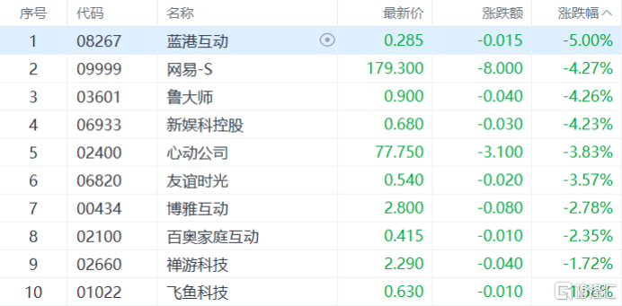 游戏软件股弱势,蓝港互动跌5%,网易、鲁大师、心动公司等多股跟跌。