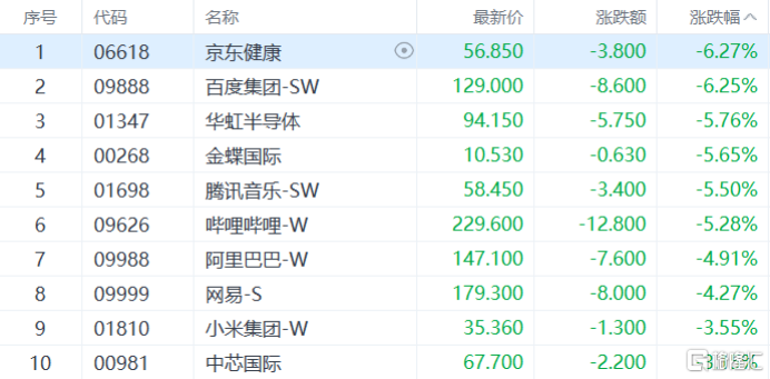 大型科技股普跌,百度跌超6%,阿里、网易跌超4%,小米、中芯国际等多股跟跌。