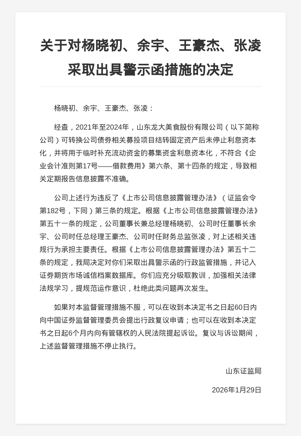 蓝鲸新闻2月2日讯,近日,山东证监局发布行政监管措施决定书,剑指山东龙大美食股份有限公司及相关责任人。