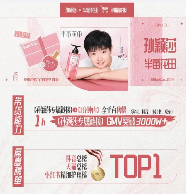 签约当月,孙颖莎代言的“香蓬瓶”在发布后1小时,GMV(商品交易总额)突破3000万元。2025年前三季度,半亩花田发部洗护品类营收为4.82亿元,同比增长496.1%,为半亩花田贡献了约25.4%的营收。