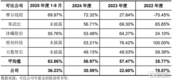 报告期内,燧原科技的毛利率分别为78.07%、22.60%、30.59%、36.23%,存在较大波动,且2023年至2025年1-9月公司毛利率低于可比公司平均水平。