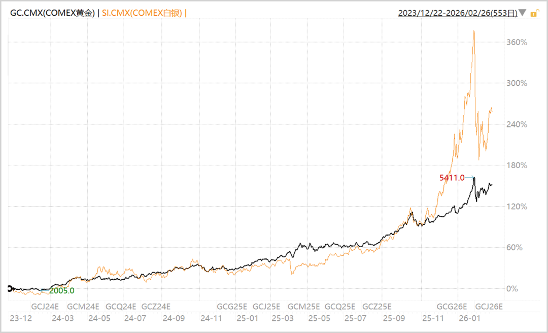 以本轮黄金行情为例,大致启动于2024年2月,当时一举突破2020年8月历史高点。此后便一发不可收拾,从2000美元/盎司一路攀升至如今的5200美元/盎司,涨幅超150%。同期,白银最高涨幅高达400%。