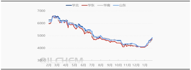 图:国内丙酮市场价格变化趋势(单位:元/吨),来源:隆众资讯