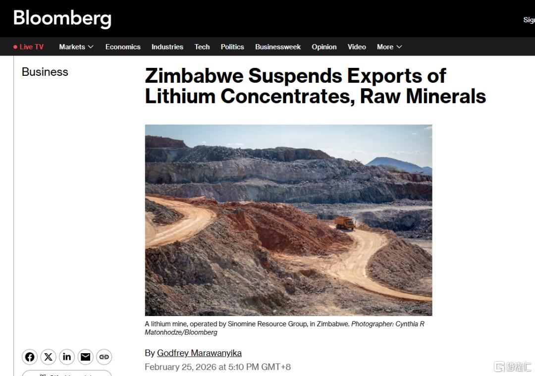 中信证券指出,津巴布韦矿业部发布锂矿出口禁令,此次政策旨在加强矿产监管,推动矿产品深加工发展。2025年中国19%的进口锂精矿来自津巴布韦,预计2026年津巴布韦锂资源产量占全球12%,该国的锂矿出口禁令将导致中国碳酸锂短期供应愈发紧缺,有望推动锂价大幅上涨。建议关注不受出口政策影响的标的。