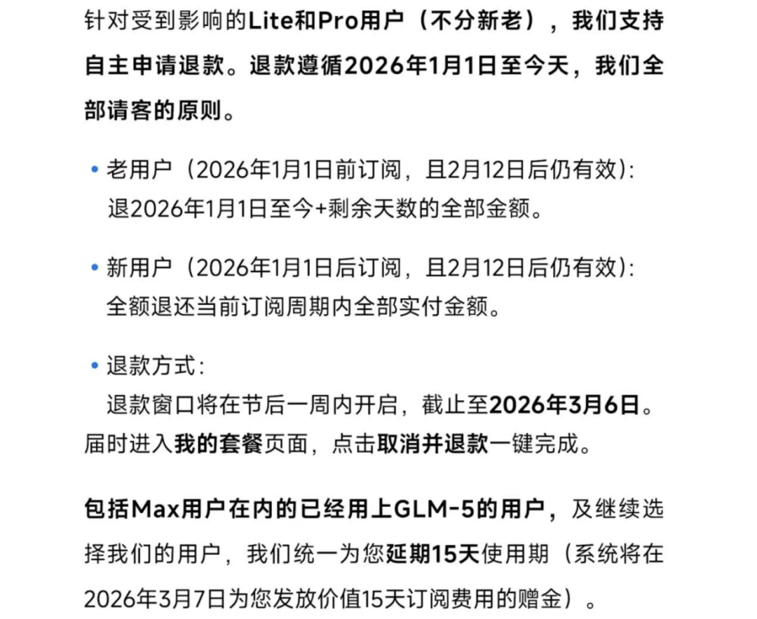 针对受到影响的Lite和Pro用户,公司支持自主申请退款,如不选择退款,则包括Max在内的所有用户统一延期15天。