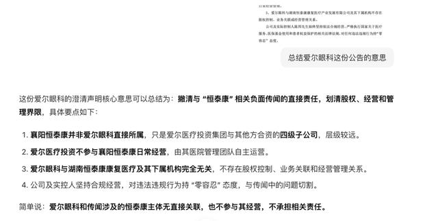 澄清爱尔医疗不参与恒泰康医院的运营,还帮创始人找补了一句。但这里面唯一正确的一句,是襄阳恒泰康医院并不直接隶属爱尔眼科。