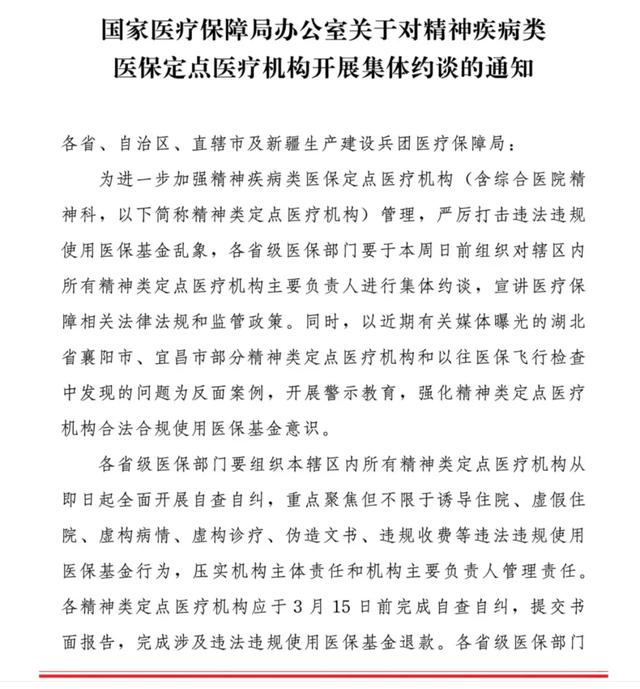目前,国家医保局已经发布通知,要求各地医保局对精神疾病类医保定点医疗机构,开展集体约谈。