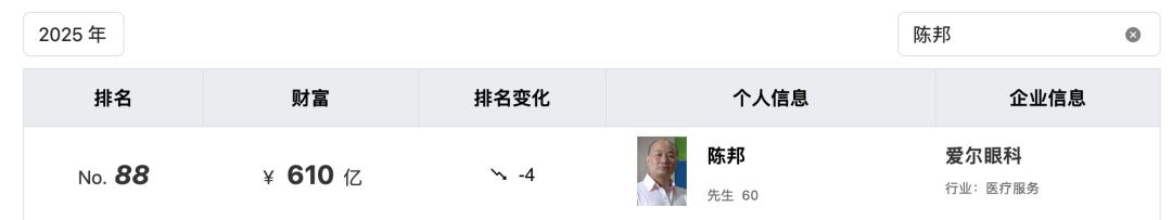 近两年,爱尔眼科股价大幅下滑,但陈邦仍然身家不菲。根据2025福布斯中国内地富豪榜,陈邦身价高达76亿美元,约合524亿元人民币