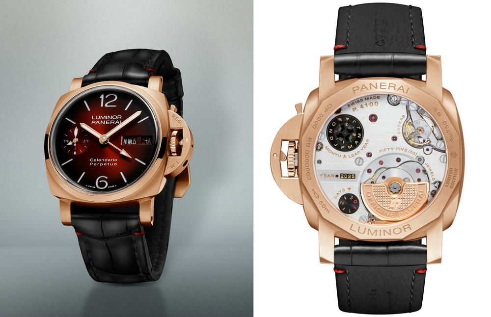 沛纳海Luminor庐米诺系列万年历作品PAM01688腕表采用Goldtech红金材质搭配酒红色表盘,星期及日期盘特别设计为中文显示,同时以寓意吉祥的“88”融入腕表型号,以此致敬中国农历新年。腕表所搭载的P.4100自动上链机芯,历经沛纳海创意工坊长达十年的潜心研发,具备两个发条盒,可提供长达三日的动力储存,并配有微型金质偏心摆陀,振动频率为4赫兹。机芯配有一枚可旋转的圆盘,无需调整机芯内部任何部件,即可自动计算月份天数及闰年至2099年。