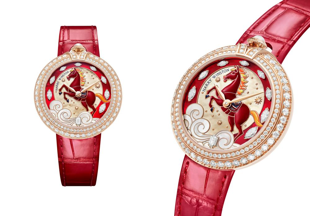 海瑞温斯顿Moments系列推出一款奢华玫瑰金腕表,这款马年主题腕表限量发行8枚。表盘以红色和金色为主调,中央是一匹火红的骏马,采用立体镶贴工艺固定于表盘,身体部分以手工涂覆的红色漆面装饰。表盘底部的飘逸祥云采用手工打造的珍珠母贝镶嵌工艺,榄尖形切工钻石镶嵌于马蹄形表圈之上,可作为时标使用。表盘6点钟位置镶嵌着一颗祖母绿型切工钻石,这是海瑞温斯顿品牌的标志性设计之一。腕表还配有性能卓越的瑞士自动机芯,动力储存长达40小时。