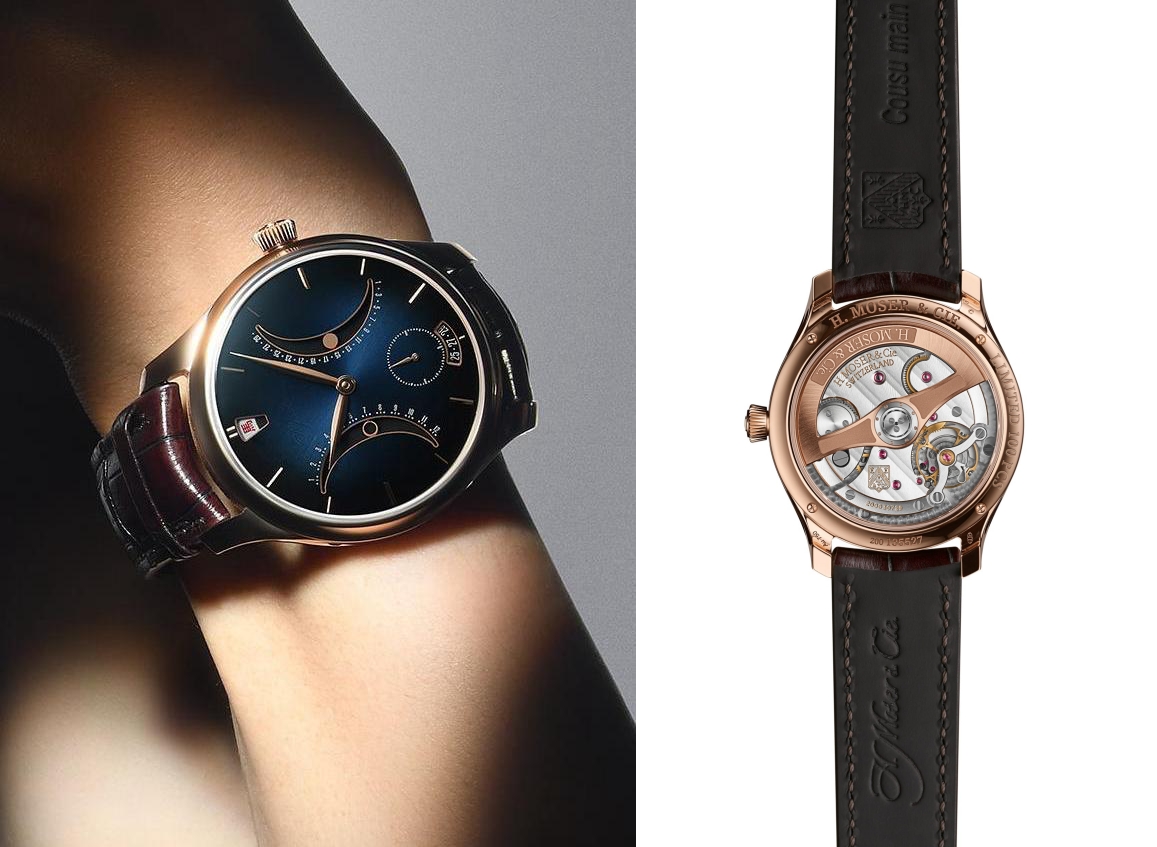亨利慕时发布勇创者系列中华历限量款腕表,该表款限量仅100枚。腕表采用5N红金表壳,搭配午夜蓝fumé烟熏表盘,表盘上饰以透明漆色H. Moser & Cie.标志。表盘左右两侧各设有一个月牙形视窗,左侧指示农历月份,右侧同时显示农历日期和月相盈亏变化。6点位置设有小秒盘,其下方为格里高利历日期视窗。腕表搭载HMC 210自动上链自产机芯,此机芯搭载由日内瓦著名制表工坊Agenhor SA特别研发的历法功能模块,巧妙地采用了两枚并行运作的凸轮,借助触杆传递农历月份数量和天数信息,做到12年无需人工干预自动调历。