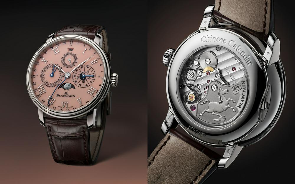 宝珀限量发行50枚的专属生肖款时计采用了全新的三文鱼色大明火珐琅表盘,这枚以22K白色金打造的摆陀,经制表师手工雕刻,并施以霜金打磨与细腻微雕,描绘了神驹四蹄腾空、踏燕飞驰的图景,一枚天然红宝石及汉字“丙午”为摆陀点睛。全新表款的中华年历机制由宝珀自主设计、生产的3638机芯供能驱动,凭借内部搭载的三个发条盒,实现了可达7天的超长动力储存。
