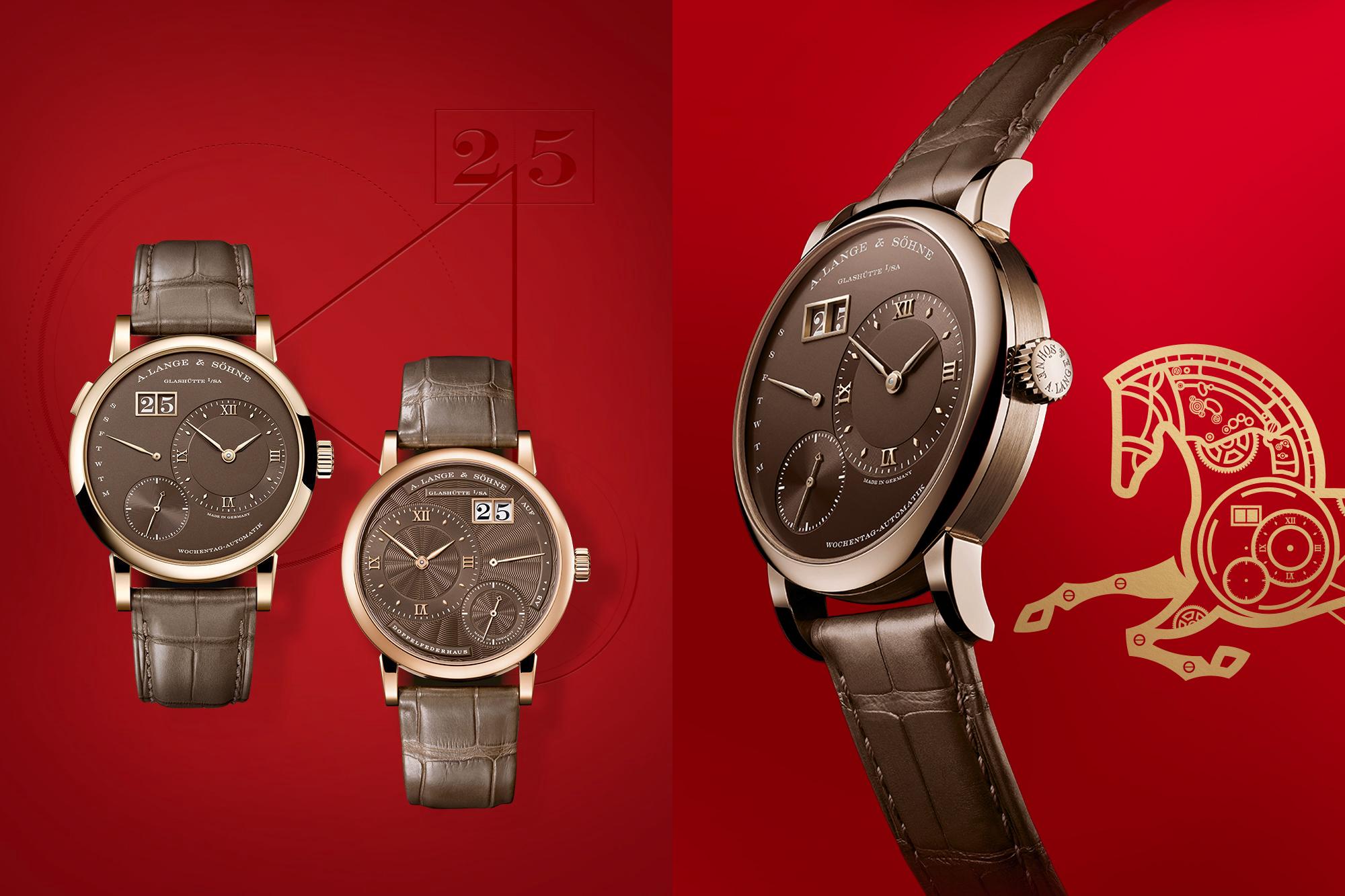 朗格1逆跳星期自动腕表750蜂蜜金款和朗格1小型款腕表750玫瑰金款均采用该系列标志性的偏心设计并且呈镜像显示,并且两款腕表均搭配棕色表盘和褐灰色鳄鱼皮表。前者直径为39.5毫米,表盘上其大日历显示以白色数字跃然于棕色背景之上,时、分盘的刻度外圈略呈下陷以呈现立体效果。后者直径为36.8毫米,表盘饰以扭索雕纹,呈现波光粼粼的视觉效果。