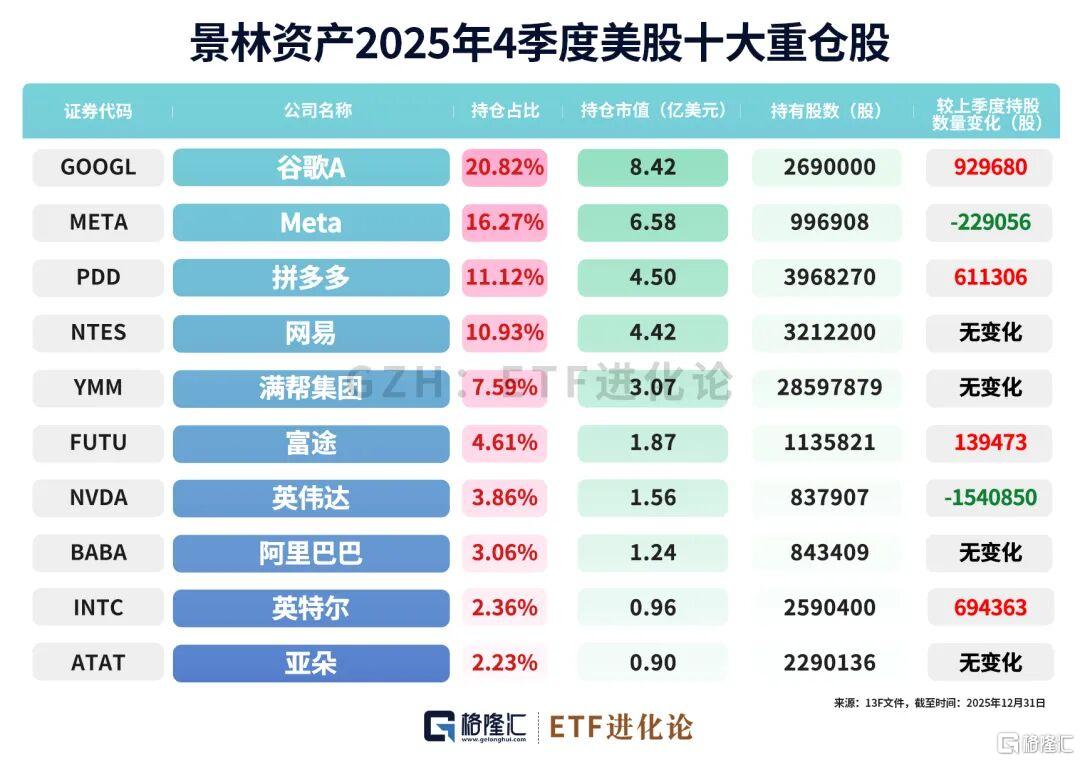 截至去年12月31日,景林资产美股持仓市值约为40.45亿美元,前十大重仓股分别是:谷歌、Meta、拼多多、网易、满帮、富途、英伟达、阿里巴巴、英特尔、亚朵。