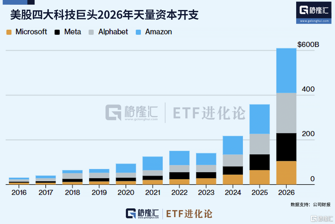 随着人工智能竞争加剧,根据亚马逊 (2000亿) 、谷歌 (1800亿) 、微软 (1500亿) 、Meta (1350亿)最新指引,仅这四家巨头今年就要在AI基建上投入超6500亿美元,同比增长60%。