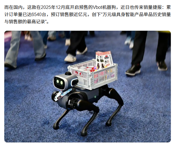 2026年初,维他动力在3个月内获得了两轮共计3亿元投资、其Vbot超能机器狗累计卖出6540台,预订销售额近亿元,未来三年目标销量定在百万台。