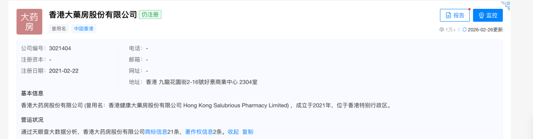 天眼查显示,厦门市极派购电子商务有限公司成立于2025年6月,注册资本10万元,是一家以从事零售业为主的企业,其股权信息中,未见任何与“香港大药房”相关的持股记录。