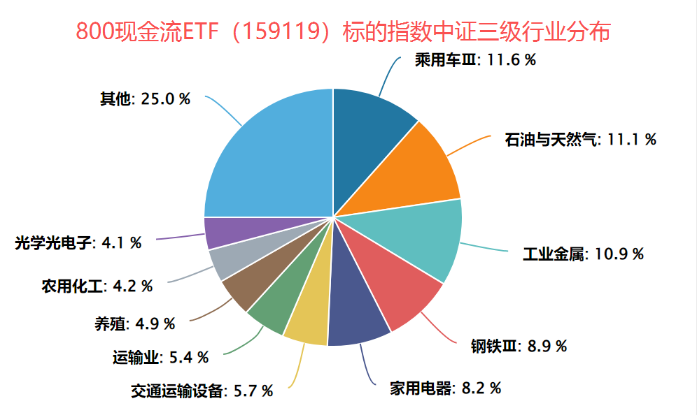 从行业分布上来看,800现金流ETF(159119)跟踪中证800自由现金流指数,标的指数前6大行业分别为乘用车III(12%)、石油与天然气(11%)、工业金属(11%)、钢铁III(9%)、家用电器(8%)和交通运输设备(6%)——绝大部分属于HALO资产(周期/稳定/重资产制造),左侧布局价值凸显。